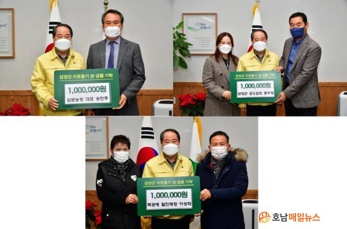´ã¾ç±ºÀº Á×°ø¿¹ÇÒÀθÅÀå À̼ºÈ ´ëÇ¥, °¨·Î³óÀå ¼ÛÀÎÁÖ ´ëÇ¥, ´ã¾ç±º ±ÃµµÇùȸ Ãѹ«Á¤¿¡¼ °¢ 100¸¸ ¿øÀ» ±âŹÇÏ¸ç ¾î·Á¿î ÀÌ¿ô¿¡°Ô µû¶æÇÑ Á¤À» ÀüÇß´Ù°í ¹àÇû´Ù.