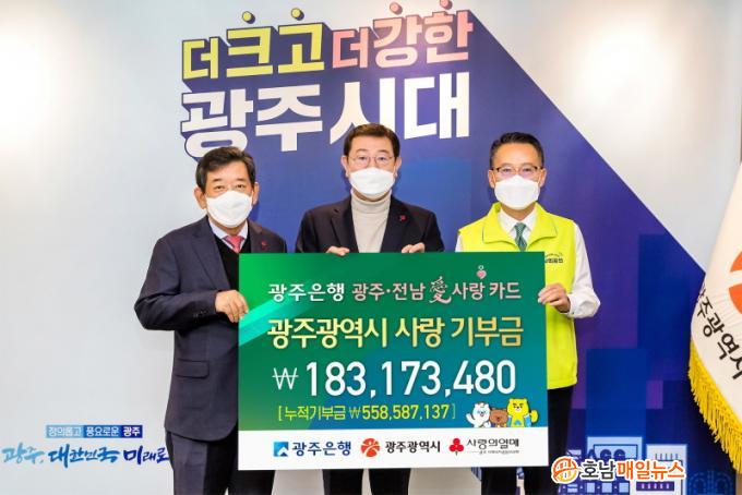 ¿ÃÇØ·Î 4³â° ¡®±¤ÁÖ¡¤Àü³²äñ»ç¶ûÄ«µå¡¯ÀÇ °íÇâ»ç¶û ±âºÎ±ÝÀ» Àü´ÞÇϰí ÀÖ´Â ±¤ÁÖÀºÇàÀº 2018³â¿¡ 1¾ï2õ9¹é¸¸¿ø, 2019³â¿¡ 2¾ï9õ5¹é¸¸¿ø, 2020³â¿¡ 2¾ï9õ6¹é¸¸¿ø, ´©Àû 10¾ï3õ¸¸¿øÀ» ±¤ÁÖ¡¤Àü³² »çȸº¹Áö°øµ¿¸ð±Ýȸ¿¡ ±âºÎÇϸç Áö¿ª¹ÐÂø°æ¿µÀ» ÅëÇÑ Áö¿ª»çȸ·ÎÀÇ ³ª´®À» ½ÇõÇϰí ÀÖ´Ù.
