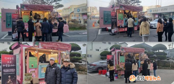Çùȸ´Â À̳¯ º¸°Ç¼Ò¿Í ±ºÃ»À» ã¾Æ ÁÖÂ÷Àå¿¡ Ä¿ÇÇ Æ®·°À» ¼³Ä¡ÇÏ°í ¡®ÇÑ ÇØ ¼ö°íÇϼ̽À´Ï´Ù¡¯¶ó´Â ¸Þ½ÃÁö°¡ ÀûÈù Ç÷¡Ä«µå ¾Õ¿¡¼ ±Ù¹«ÇÏ´Â Á÷¿øµé¿¡°Ô Ä¿ÇÇ 1,000ÀÜÀ» ¹«·á·Î Á¦°øÇß´Ù.