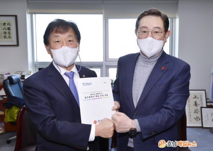 ±¤Áֽô ´ë¼±°ø¾à¿¡ ¹Ý¿µÇØ¾ß ÇÒ ¡®½Ã¹ÎÀÌ ÇູÇÑ ´õ Å©°í ´õ °ÇÑ ¹Ì·¡ ±¤ÁÖ¡¯¸¦ À§ÇÑ °úÁ¦ÀÎ ¡ã±¤ÁÖ¡¤Àü³²ÀÇ »ó»ý°ú µ¿¹Ý¼ºÀåÀ» µµ¸ðÇϱâ À§ÇØ ÀÓ±â Áß ±¤ÁÖ ±º °øÇ× ÀÌÀü ¹®Á¦ ÇØ°á(±¹°¡»ç¾÷È) ¡ã1800¸¸ µ¿¡¤¼ ±¤¿ª °æÁ¦±ÇÀ» ±¸ÃàÇØ Áö¿ª ±ÕÇü¹ßÀüÀ» µµ¸ðÇϱâ À§ÇÑ ±¤ÁÖ-´ë±¸ ´Þºû°í¼Óöµµ Àӱ⠳» Á¶±â Âø°ø(¿¹ºñŸ´ç¼ºÁ¶»ç ¸éÁ¦) ¡ã±¤ÁÖ¿Í ÀÎÁ¢ÇÑ 5°³ ½Ã¡¤±º(³ªÁÖ, ȼø, ´ã¾ç, ÇÔÆò, À强)À» ´ÜÀÏ °æÁ¦±ÇÀ¸·Î ¹¾î ÀΰøÁö´É ±â¹ÝÀÇ ºû°íÀ» ½º¸¶Æ® ¸Þ°¡½ÃƼ·Î Á¶¼º ¡ã¾Æ½Ã¾Æ¹®ÈÁ߽ɵµ½Ã ±¤ÁÖ¸¦ ´ëÇ¥ÇÏ´Â °ø¿¬¿¹¼ú ÀÎÇÁ¶ó È®º¸¸¦ À§ÇÑ ±¤ÁÖ ¾Æ½Ã¾Æ ¾ÆÆ®½ºÄù¾î Á¶¼º µîÀ» ¼³¸íÇϰí ÇùÁ¶¸¦ ¿äûÇß´Ù.