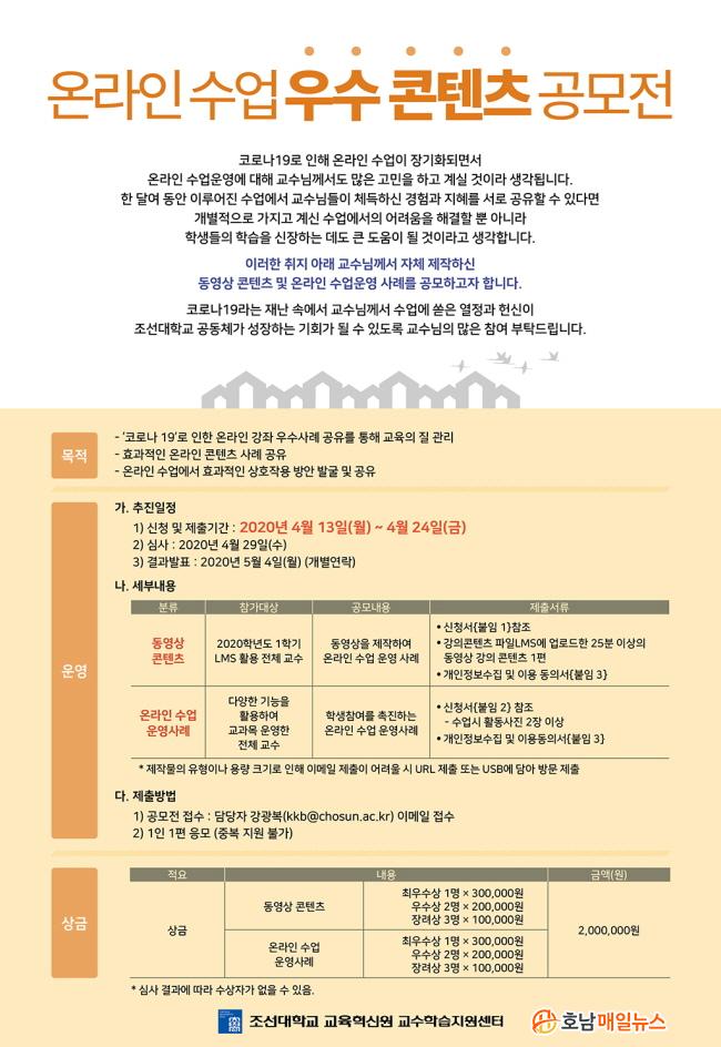 Á¶¼±´ëÇб³´Â ¿Â¶óÀÎ °ÀÇ ¿ì¼ö»ç·Ê¸¦ ¹ß±¼ÇÏ°í °øÀ¯Çϱâ À§ÇØ ¡®¿Â¶óÀÎ ¼ö¾÷ ¿ì¼ö ÄÜÅÙÃ÷ °ø¸ðÀü¡¯À» °³ÃÖÇÑ´Ù. Á¶¼±´ëÇб³´Â ¿Â¶óÀÎ °ÀÇ ¿ì¼ö»ç·Ê ½Ã»óÀ» ÅëÇØ ÁÖµµÀûÀÎ ¿Â¶óÀÎ °Àǹý ¿ª·® °È¸¦ À¯µµÇÒ ¸ñÀûÀ¸·Î À̹ø °ø¸ðÀüÀ» ¸¶·ÃÇß´Ù.