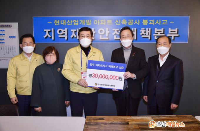 ¼ÛÇÏÁø ½ÃµµÁö»çÇùÀÇȸÀå(ÀüºÏµµÁö»ç)Àº 25ÀÏ ¿ÀÈÄ Á¶¸í¿ì »ç¹«ÃÑÀå, °½Â±¸ ÀüºÏµµ ±âȹÁ¶Á¤½ÇÀå°ú ÇÔ²² »ç°í ÇöÀå¿¡ ²Ù·ÁÁø Áö¿ªÀç³¾ÈÀü´ëÃ¥º»ºÎ¸¦ ã¾Æ °ü°èÀÚµéÀ» À§·Î¡¤°Ý·ÁÇÏ°í ±¸Á¶´ë¿ø ¹× ÀÚ¿øºÀ»çÀÚ ±¸È£¹°Ç° µîÀÇ Áö¿ø±Ý 3000¸¸¿øÀ» Àü´ÞÇß´Ù.