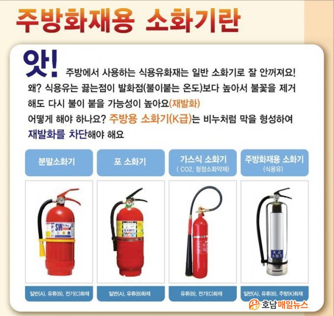 ÁÖ¹æ¿ë ¼Òȱâ´Â ½Ä¿ëÀ¯ µî ±â¸§ ÈÀç ½Ã ±â¸§ Ç¥¸é¿¡ ¸·À» Çü¼ºÇØ ¿Âµµ¸¦ ³·Ãß°í »ê¼Ò°ø±ÞÀ» Â÷´ÜÇÏ´Â ¿ªÇÒÀ» Çϸç, ±â¸§ÈÀç´Â ÈÀç ½Ã ¹°À» »Ñ¸®¸é ±Þ°ÝÈ÷ ÈÀç°¡ È®´ëµÇ°í ÈÀç°¡ ´Ù½Ã ¹ß»ýÇÒ °¡´É¼ºÀÌ ³ô±â ¶§¹®¿¡ ÀûÀÀ¼ºÀÌ ÀÖ´Â ÁÖ¹æ¿ë¼Òȱâ(K±Þ)¸¦ »ç¿ëÇØ ¿ÏÀüÈ÷ ÁøÈÇØ¾ß ÇÑ´Ù.