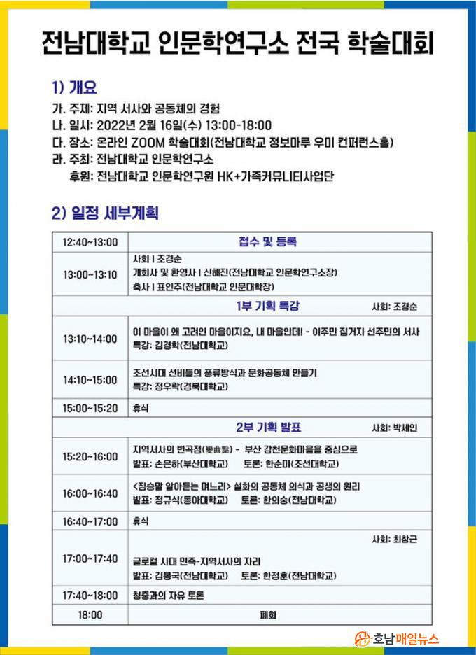 Àü³²´ë Àι®Çבּ¸¼Ò(¼ÒÀå ½ÅÇØÁø ±³¼ö)´Â ¿À´Â 2¿ù 16ÀÏ ¿ÀÈÄ 1½Ã Àü³²´ë Á¤º¸¸¶·ç ¿ì¹ÌÄÁÆÛ·±½º Ȧ¿¡¼ ¡®Áö¿ª ¼»ç¿Í °øµ¿Ã¼ÀÇ °æÇ衯À̶ó´Â ÁÖÁ¦·Î ¡¸2022³â Àü±¹Çмú´ëȸ¡¹¸¦ °®´Â´Ù. Çмú´ëȸ´Â ¿Â¶óÀÎ(ZOOM)À» ÀÌ¿ëÇØ µ¿½Ã¿¡ ÁøÇàµÈ´Ù.