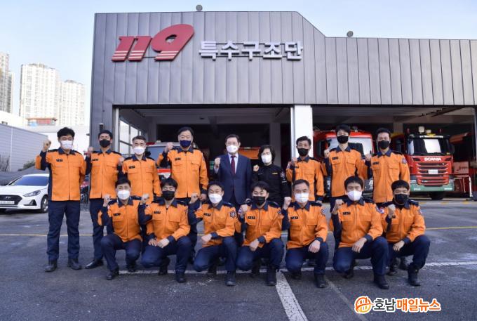 [È£³²¸ÅÀÏ´º½º] À̿뼷 ±¤ÁÖ±¤¿ª½ÃÀåÀÌ 17ÀÏ ¿ÀÈÄ ±¤»ê±¸ 119Ư¼ö±¸Á¶´ÜÀ» ¹æ¹®ÇØ Çö´ë»ê¾÷°³¹ß ¾ÆÆÄÆ® ½ÅÃà°ø»ç ºØ±«»ç°í ½ÇÁ¾ÀÚ ¼ö»ö¡¤±¸Á¶ ÀÓ¹«¿¡ Âü¿©ÇÑ ¼Ò¹æ°üµéÀ» °Ý·ÁÇϰí ÀÖ´Ù