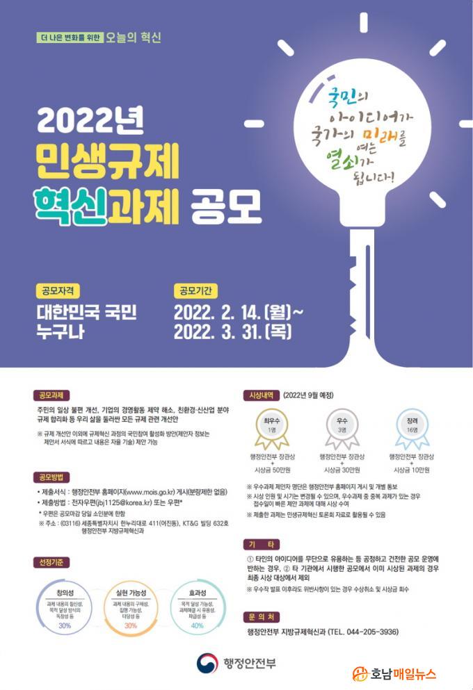 À̹ø °ø¸ðÀüÀº ½Ã¹ÎÀÇ ÀÏ»ó»ýȰÀ̳ª ±â¾÷ÀÇ °æ¿µÈ°µ¿¿¡ ºÒÆíÀ» ÁÖ´Â ºÒÇÕ¸®ÇÑ ±ÔÁ¦¸¦ ¹ß±¼Çϰí ÇØ¼ÒÇϱâ À§ÇØ ¡®±¹¹ÎÀÇ ¾ÆÀ̵ð¾î°¡ ±¹°¡ÀÇ ¹Ì·¡¸¦ ¿©´Â ¿¼è°¡ µË´Ï´Ù¡¯´Â ÁÖÁ¦·Î ¿À´Â 3¿ù 31ÀϱîÁö ÁøÇàµÈ´Ù.
