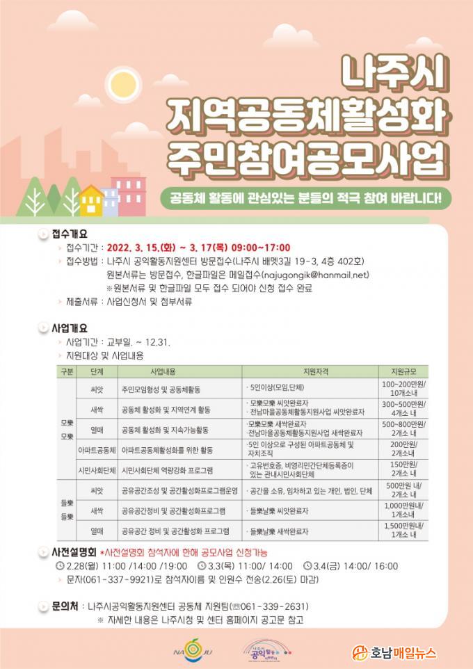 ¼³¸íȸ¿¡ Âü¿©ÇÒ ÁֹΡ¤°øµ¿Ã¼´Â ³ªÁֽðøÀÍȰµ¿Áö¿ø¼¾ÅÍ(¢Î061-337-9921)¿¡ Àοø¼ö¿Í Âü¼®ÀϽø¦ ¹®ÀÚ·Î Àü¼ÛÇÏ¸é µÈ´Ù. °øÀÍȰµ¿Áö¿ø¼¾ÅÍ´Â »çÀü¼³¸íȸ ÀÌÈÄ »ç¾÷°èȹÄÁ¼³ÆÃ, ½É»ç µîÀ» °ÅÃÄ ¿À´Â 4¿ù ÃÊ »ç¾÷ ´ë»óÀÚ¸¦ ¼±Á¤ÇÒ ¿¹Á¤ÀÌ´Ù.