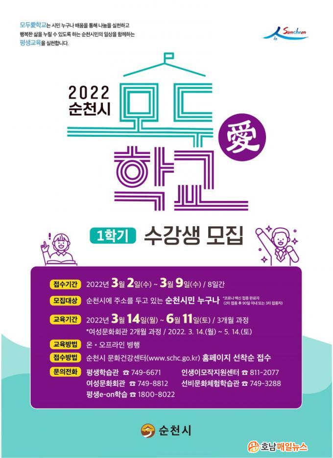 ¼ö°½Åû Á¢¼ö´Â ¿À´Â 9ÀϱîÁö ¼øÃµ½Ã¹®È°Ç°¼¾ÅÍ Æò»ý±³À°Æ÷ÅРȨÆäÀÌÁö¿¡¼ °¡´ÉÇϸç, 3¿ù 14ÀϺÎÅÍ 3°³¿ù ¶Ç´Â 2°³¿ù °úÁ¤À¸·Î ¿î¿µµÈ´Ù. ¾Æ¿ï·¯ Áö¼ÓÀû ÇнÀÀ» À§ÇÑ ·£¼±À¸·Î ¸¸³ª´Â ºñ´ë¸é ¿Â¶óÀÎ °ÁÂÀÎ ¹Î°£ÀÚ°ÝÁõ °úÁ¤ Æò»ý e-onÇнÀ 22°³ °ÁÂ¿Í ½º¸¶Æ®e-·±ÇнÀ 2,000°Á°¡ ¹«·á·Î Á¦°øµÈ´Ù.