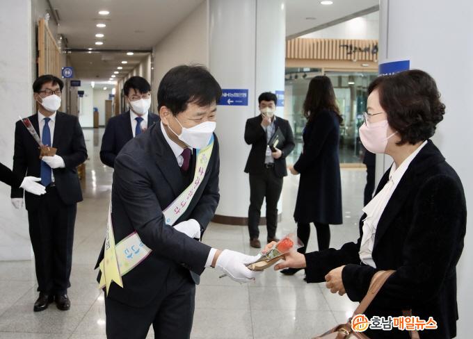 Àå¼®¿õ ±³À°°¨À» ºñ·ÔÇÑ µµ±³À°Ã» °£ºÎµé°ú ÀÌâ±â Àü³²¿µ¾÷º»ºÎÀå µî NH³óÇùÀºÇà °ü°èÀÚµéÀº À̳¯ ¿ÀÀü Ãâ±Ù ½Ã°£, µµ±³À°Ã» 1Ãþ Çö°ü¿¡¼ Ãâ±ÙÇÏ´Â ¿©Á÷¿øµé¿¡°Ô Àå¹Ì²É°ú »§À» ³ª´²Áá´Ù.