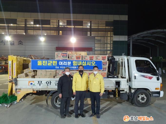 ¹«¾È±º¿¡ µû¸£¸é 7ÀÏ ¿ÀÈÄ ¹«¾È±ºÃ»¿¡¼ ÄŶó¸é°ú »ý¼ö, ¼ö°Ç, ¾çÆÄÀ½·á µîÀ» ½ÇÀº Â÷·®ÀÌ 7½Ã°£À» ´Þ·Á ¿ïÁø±º ÀÌÀç¹Î ´ëÇǼҿ¡ µµÂøÇØ ½ÇÀÇ¿¡ ºüÁø Áֹε鿡°Ô À§·Î¿Í Èñ¸ÁÀ» Áá´Ù.