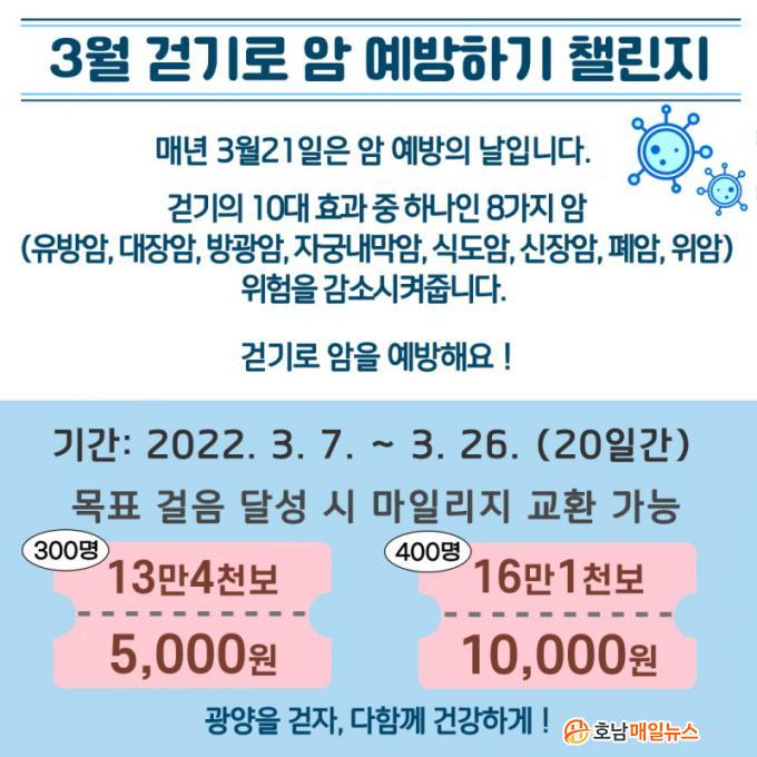 ÇÑÆí, ±¤¾ç½Ã ¼¿µ¿Á °Ç°ÁõÁø°úÀåÀº ¡°¿öÅ©¿Â ¾Ï ¿¹¹æ 縰Áö¸¦ ÅëÇØ ½Ã¹ÎµéÀÌ ½º½º·Î ¾Ï ¿¹¹æ¼öÄ¢À» ½ÇõÇÏ¸ç °Ç°ÇÑ °È±â ¹®È°¡ Á¶¼ºµÇ±æ ¹Ù¶õ´Ù¡±°í ¸»Çß´Ù.Áö¿ªÀº ±¤¾çÀ¸·Î Á¦ÇÑ ¼³Á¤ÇÑ µÚ ¹Ýµå½Ã ÈÞ´ëÆù À§Ä¡¼³Á¤À» ¹Ýµå½Ã ÄÑ¾ß Âü¿©ÇÒ ¼ö ÀÖÀ¸¸ç, ÀÚ¼¼ÇÑ »çÇ×Àº ±¤¾ç½Ãº¸°Ç¼Ò(¢Ï061-797-3797)·Î ¹®ÀÇÇÏ¸é µÈ´Ù.