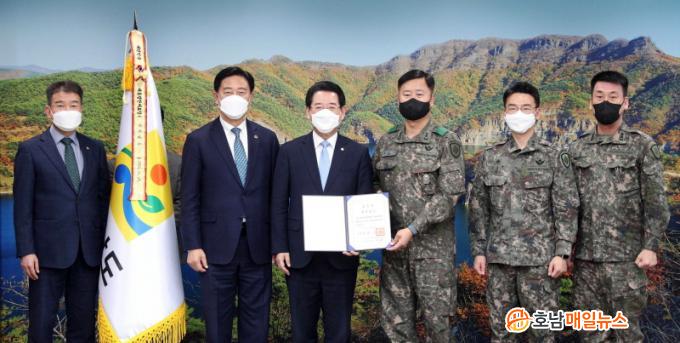 ÀÌ¿Í ÇÔ²² ¿¹ºñ±º À°¼ºÁö¿ø ¹× ÅëÇÕ¹æÀ§Å¼¼¿¡ Å« ÈûÀ» º¸ÅÄ Àü³²µµ¿Í Àü³²µµÀÇȸ¸¦ À§ÇØ À°±º2ÀÛÀü»ç·É°ü(´ëÀå ±èÁ¤¼ö)ÀÌ ¸¶·ÃÇÑ °¨»çÆÐµµ Àü´ÞÇß´Ù.