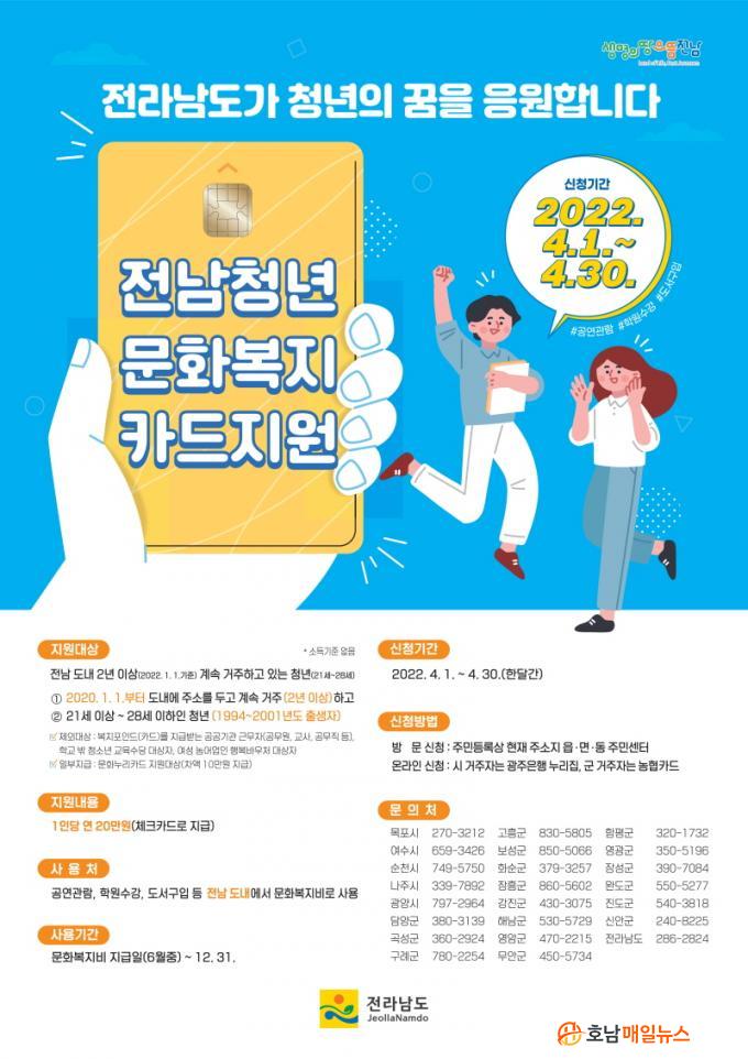 ¿ÃÇØ óÀ½À¸·Î ½ÃÇàµÇ´Â ¡®Àü³²Ã»³â ¹®Èº¹ÁöÄ«µå Áö¿ø»ç¾÷¡¯Àº µµ³» °ÅÁÖÇϰí ÀÖ´Â 21~28¼¼(1994~2001³â»ý) û³â¿¡°Ô 1ÀÎ´ç ¿¬ 20¸¸¿øÀÇ ¹®È»ýȰºñ¸¦ Áö±ÞÇÏ´Â »ç¾÷ÀÌ´Ù.