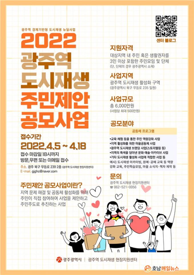 ¡®±¤ÁÖ¿ª µµ½ÃÀç»ý ÁÖ¹ÎÁ¦¾È °ø¸ð»ç¾÷¡¯Àº ÁÖ¹ÎÀÌ Á÷Á¢ Á¦¾ÈÇÏ°í ½ÇÇàÇÏ´Â »ç¾÷À¸·Î ¿ÃÇØ »ç¾÷ºñ´Â 6000¸¸¿øÀ̸ç, »ç¾÷´ç ÃÖ´ë 500¸¸¿øÀ» Áö¿øÇÑ´Ù. ½Åû ÀÚ°ÝÀº ±¤ÁÖ¿ª »ç¾÷±Ç¿ª ³» 3ÀÎ ÀÌ»ó ÁֹΡ¤»ýȰ±ÇÀÚ(¸ðÀÓ) ¶Ç´Â ´ÜüÀÌ¸ç ½Åû±â°£Àº 5ÀϺÎÅÍ 18ÀϱîÁö´Ù.