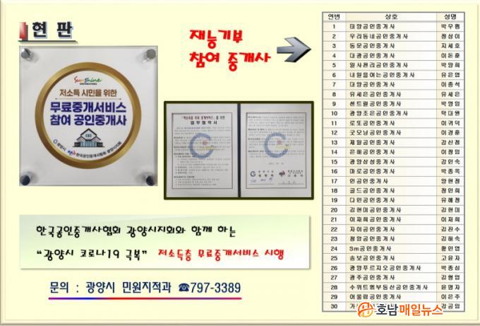 ±¤¾ç½Ã´Â º» »ç¾÷À» ÃßÁøÇϱâ À§ÇØ Çѱ¹°øÀÎÁß°³»çÇùȸ ±¤¾ç½ÃÁöȸ¿Í ¾÷¹« Çù¾àÀ» ü°áÇØ Áö³ 4¿ù 1ÀϺÎÅÍ º»°ÝÀûÀ¸·Î ÃßÁøÇϰí ÀÖ´Ù. ÁÖ°Å ÀÌÀü¿¡ µÚµû¸£´Â °æÁ¦Àû ºÎ´ãÀ» ´ú¾îÁÖ±â À§ÇØ ÃßÁøÇÏ´Â º» »ç¾÷Àº »çȸ ¹è·Á°èÃþÀÎ ´ë»óÀÚ°¡ Áß°³¸¦ ¿øÇϸé Àç´É±âºÎ¸¦ ½ÅûÇÑ Áö¿ª ³» ºÎµ¿»ê Áß°³»ç¹«¼Ò 30°³¼Ò¸¦ ÅëÇØ ¹«·áÁß°³ ¼ºñ½º¸¦ Áö¿øÇÏ´Â °ÍÀÌ´Ù.