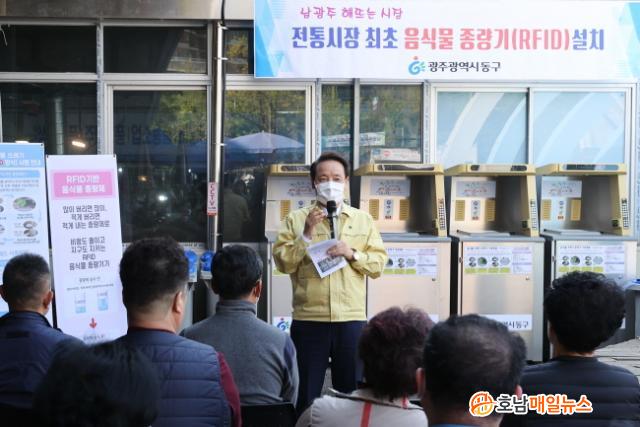µ¿±¸´Â ÃÖ±Ù Àü±¹¿¡¼ óÀ½À¸·Î ³²±¤ÁÖÇØ¶ß´Â½ÃÀå¿¡ À½½Ä¹°Ã³¸®Á¾·®±â¸¦ ¼³Ä¡Çß´Ù. À½½Ä¹°Ã³¸®Á¾·®±â´Â ¹«¼±Á֯ļö¸¦ ÀÌ¿ëÇØ ´ë»óÀ» ½Äº°ÇÏ´Â ÀåÄ¡·Î ¹èÃâÄ«µå¸¦ ÀνÄÇØ »ç¿ëÀÚÁ¤º¸¸¦ È®ÀÎÇϰí À½½Ä¹° ¾²·¹±â¹«°Ô¸¦ °è»ê, ¹èÃâÇÑ ¸¸Å ¼ö¼ö·á¸¦ ºÎ°úÇÏ´Â ¹æ½ÄÀÌ´Ù.