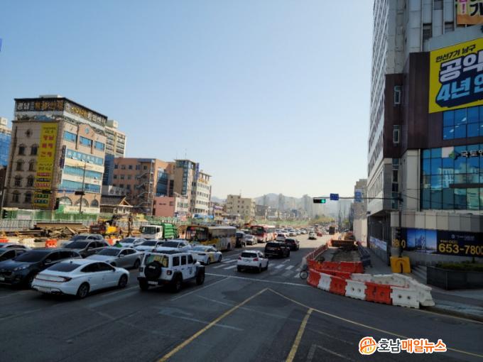 À̹ø ±³ÅëÀüȯ ±¸°£Àº ¹é¿î±¤ÀåºÎÅÍ ³²±¤ÁÖ³óÇù±îÁö ¾à 550mÀ̸ç, °ø»ç´Â 10ÀϺÎÅÍ ÀÌÆ²°£ ÁøÇàµÈ´Ù. Â÷·Î¼ö´Â ÇöÇà°ú °°ÀÌ 7Â÷·Î°¡ À¯ÁöµÇÁö¸¸, ³²±¸Ã» ¾Õ °¡½Ã¼³ °ø»ç¸¦ À§ÇØ °ø»ç Á¡À¯±¸°£ÀÌ ³Ð¾îÁö°í ÀÌ·Î ÀÎÇØ Áß¾Ó¼±ÀÌ Çª¸¥±æ ¹æÇâÀ¸·Î 3Â÷·Î À̵¿ÇÑ´Ù.