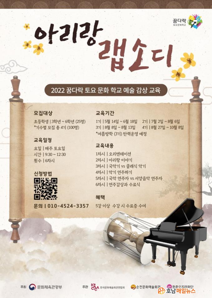 ½Ã´Â ¿À´Â 5¿ù 14ÀϺÎÅÍ 10¿ù 8ÀϱîÁö ¸ÅÁÖ Åä¿äÀÏ(09:30 ~ 12:30) ¡®¾Æ¸®¶û ·¦¼Òµð¡¯ ÇÁ·Î±×·¥À» ¿î¿µÇÑ´Ù. Âü°¡ºñ´Â ¹«·á·Î, ¼øÃµÁö¿ª °ÅÁÖ ÃʵîÇлý 3 ~ 6Çг⠴ë»ó 1±â¼ö ´ç 25¸í¾¿ ¸ðÁýÇØ 4±â 100¸íÀ¸·Î ¿î¿µÇÒ °èȹÀÌ´Ù.