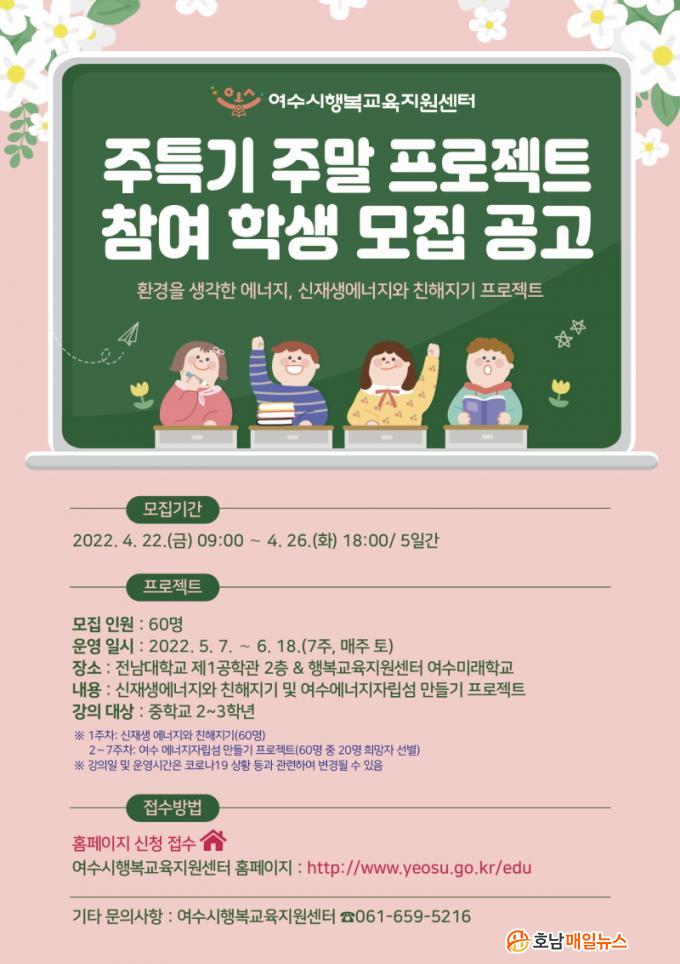 ¸ðÁý ÀοøÀº 60¸íÀ̸ç, Âü°¡¸¦ Èñ¸ÁÇÏ´Â 2,3Çгâ ÁßÇлýÀº 4¿ù 22ÀϺÎÅÍ 26ÀϱîÁö ¿©¼ö½ÃÇູ±³À°Áö¿ø¼¾ÅÍ È¨ÆäÀÌÁö¸¦ ¹æ¹®ÇØ ½ÅûÇÏ¸é µÈ´Ù. Âü°¡ ÇлýµéÀº ¸ÅÁÖ Åä¿äÀÏ Å¾ç‧dz·Â‧¼ö¼Ò¿¡³ÊÁö µî ½ÅÀç»ý¿¡³ÊÁö¿¡ ´ëÇØ ¹è¿ì°í, ¡®¿©¼ö ¿¡³ÊÁöÀÚ¸³¼¶ ¸¸µé±â¡¯¶ó´Â ÁÖÁ¦·Î âÀǼº°ú ¹Ì·¡±â¼úÀ» À¶ÇÕÇÑ Àç¹ÌÀִ üÇèµµ ÇÏ°Ô µÈ´Ù.