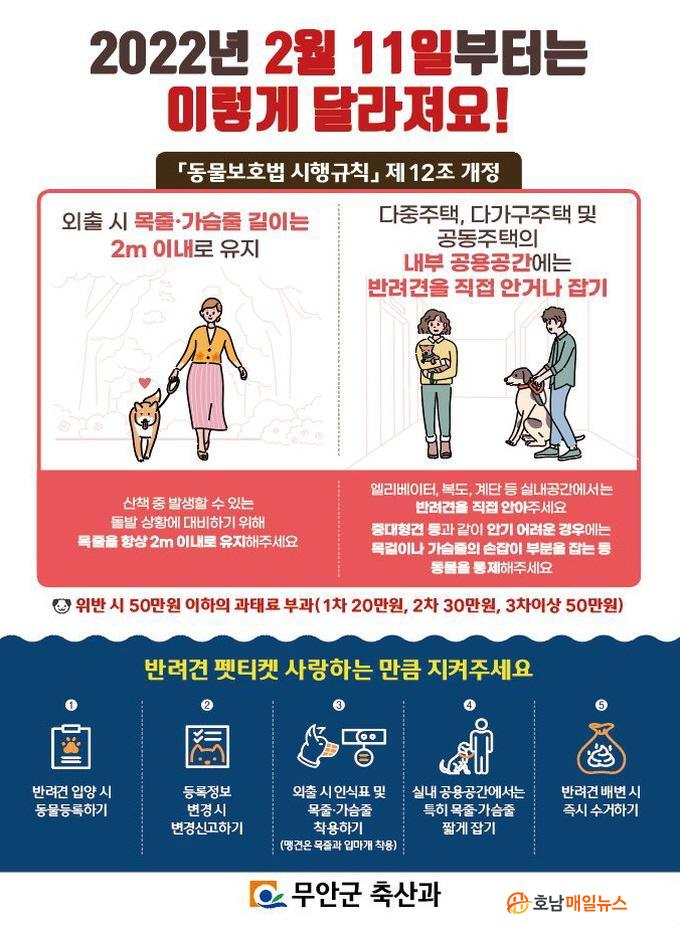 ÁÖ¿ä È«º¸³»¿ëÀº °³Á¤µÈ µ¿¹°º¸È£¹ý ½ÃÇà±ÔÄ¢¿¡ µû¶ó ¹Ý·Á°ß°ú ¿ÜÃ⠽à ¸ñÁÙ¡¤°¡½¿ÁÙ ±æÀ̸¦ 2m À̳»·Î À¯ÁöÇϱâ, °øµ¿ÁÖÅᤴٰ¡±¸ÁÖÅà ³»ºÎ °ø¿ë°ø°£¿¡¼´Â ¹Ý·Á°ßÀ» Á÷Á¢ ¾È°Å³ª Àâ±â µîÀÌ´Ù.