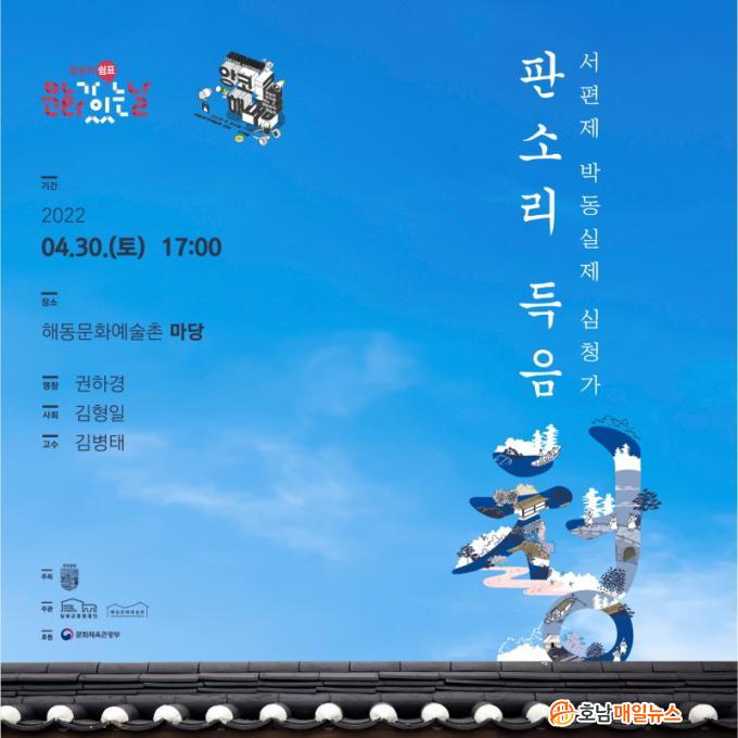 À̹ø¿¡ ÁøÇàµÇ´Â <ÆÇ¼Ò¸® µèÀ½ û : ¼ÆíÁ¦ ¹Úµ¿½ÇÁ¦ ½Éû°¡>´Â ÀüÅë ÆÇ¼Ò¸® °ø¿¬À¸·Î 4¿ù 30ÀÏ Åä¿äÀÏ ¿ÀÈÄ 5½Ã ÇØµ¿¹®È¿¹¼úÃÌ ¸¶´ç¿¡¼ ÁøÇàµÇ¸ç »çȸÀÚ ±èÇüÀÏ, ¸íâ ±ÇÇÏ°æ ±×¸®°í °í¼ö ±èº´Å°¡ ÇÔ²² ¹«´ë¸¦ ÁغñÇÑ´Ù.