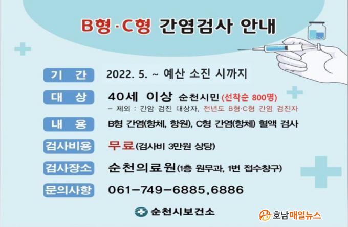 ÀÌ¿¡ ¼øÃµ½Ã´Â ¸¸ 40¼¼ ÀÌ»ó ½Ã¹Î Áß ¼±Âø¼ø 800¸íÀ» ´ë»óÀ¸·Î ¹«·á °£¿° °Ë»ç¸¦ ÃßÁøÇÑ´Ù. °Ë»ç¸¦ Èñ¸ÁÇÏ´Â ¸¸ 40¼¼ ÀÌ»ó ¼øÃµ½Ã¹ÎÀº ½ÅºÐÁõÀ» °¡Áö°í ¼øÃµÀÇ·á¿øÀ¸·Î ¹æ¹®ÇÏ¸é µÈ´Ù. ´Ü, ±¹°¡ °£¾Ï °ËÁø ´ë»óÀÚ¿Í Àü³âµµ BÇü⋅CÇü °£¿° °ËÁøÀÚ´Â Á¦¿ÜµÈ´Ù.