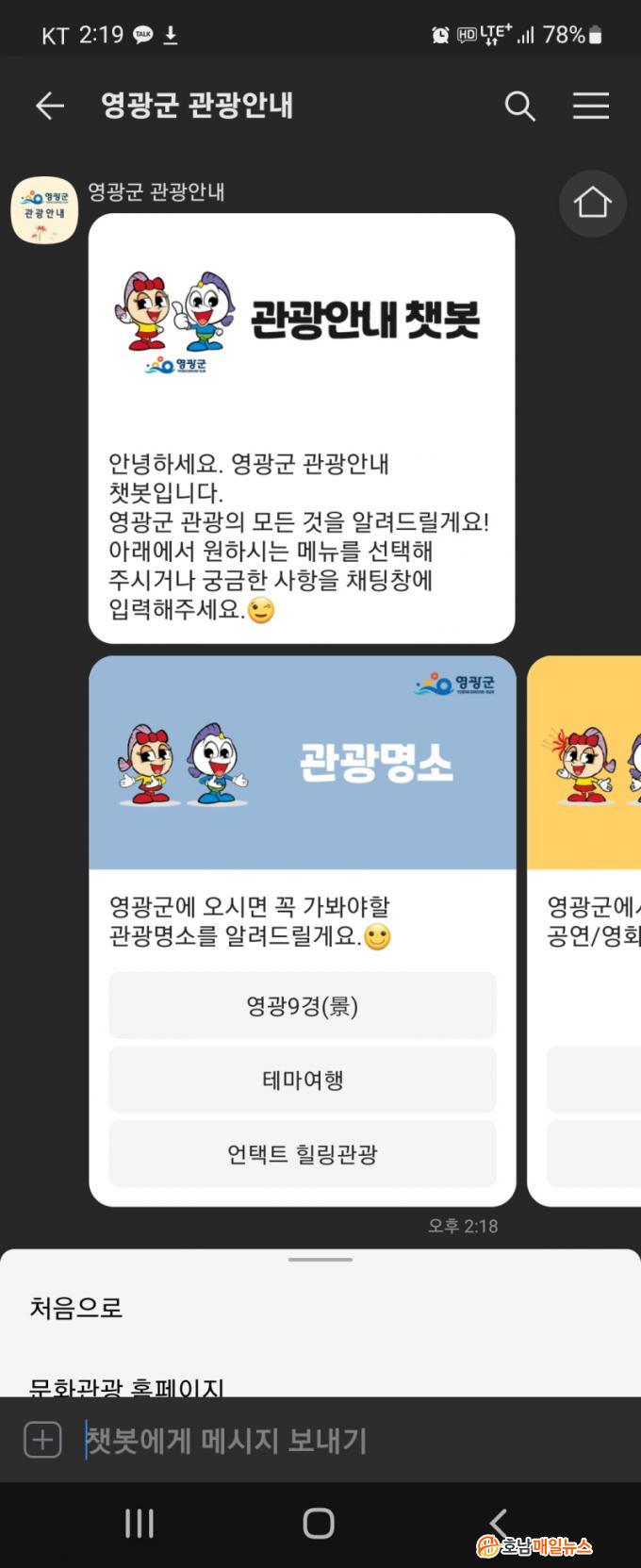 꺿Àº īī¿ÀÅå¿¡¼ ¡®¿µ±¤±º °ü±¤¾È³»¡¯Ã¤³ÎÀ» °Ë»öÇÏ¿© Ä£±¸ Ãß°¡ Çϰųª ¿µ±¤±º ¹®È°ü±¤ ȨÆäÀÌÁö(https://tour.yeonggwang.go.kr/)¸¦ ÅëÇØ¼ ÀÌ¿ëÀÌ °¡´ÉÇϸç, ÇØ´ç ±Ã±Ý»çÇ×À» ¼±ÅÃÇϰųª äÆÃâ¿¡ ÀԷ¸¸ Çϸé ÁÖ¿ä °ü±¤Áö, ÃàÁ¦¡¤Çà»ç, À½½Ä¡¤Æ¯»êǰ, ¼÷¹Ú, ±³Åë µîÀÇ ´Ù¾çÇÑ °ü±¤Á¤º¸¸¦ Áï½Ã Á¦°ø¹ÞÀ» ¼ö ÀÖ°í ½º¸¶Æ® °ü±¤Áöµµ, ½ºÅÆÇÁÅõ¾î, ¹®ÈÇØ¼³»ç ½Åû, °ü±¤°¡À̵åºÏ ½Åû µî °ü±¤°ú °ü·ÃÇÑ °¢Á¾ ºÎ°¡¼ºñ½ºµµ ¿¬°èÇÏ¿© »ç¿ëÇÒ ¼ö ÀÖ´Ù.