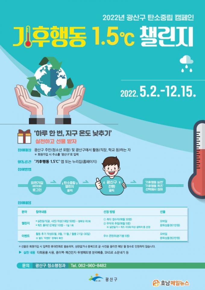 ±¤»ê±¸¿¡¼ °ÅÁÖÇϰųª Ȱµ¿Çϴ û¼Ò³â, ½Ã¹Î ¸ðµÎ°¡ Âü¿© ´ë»óÀÌ´Ù. ½º¸¶Æ®ÆùÀ¸·Î ¡®±âÈÄÇൿ 1.5¡É¡¯ ¾ÛÀ» ¼³Ä¡Çϰųª ´©¸®Áý(https://c-action.kr/)¿¡¼ ȸ¿ø°¡ÀÔÇÏ°í ¡®±¤»ê±¸ ź¼ÒÁ߸³ 縰Áö¡¯¸¦ ¼±ÅÃÇϸé Âü¿©ÇÒ ¼ö ÀÖ´Ù. ´Ùȸ¿ëÄÅ »ç¿ë, Åõ¸íÆäÆ®º´ ºÐ¸®¹èÃâ, ÀçȰ¿ë µî ź¼ÒÁ߸³ »ýȰÀ» ½ÇõÇϰí, ¾Û°ú ´©¸®ÁýÀÇ ¡®½ÇõÀϱ⡯¿¡ ±Û°ú »çÁøÀ» ¿Ã¸®°í, ¡®OX ÄûÁ¸¦ Ç®¾î Á¡¼ö¸¦ ½×´Â ¹æ½ÄÀÌ´Ù.