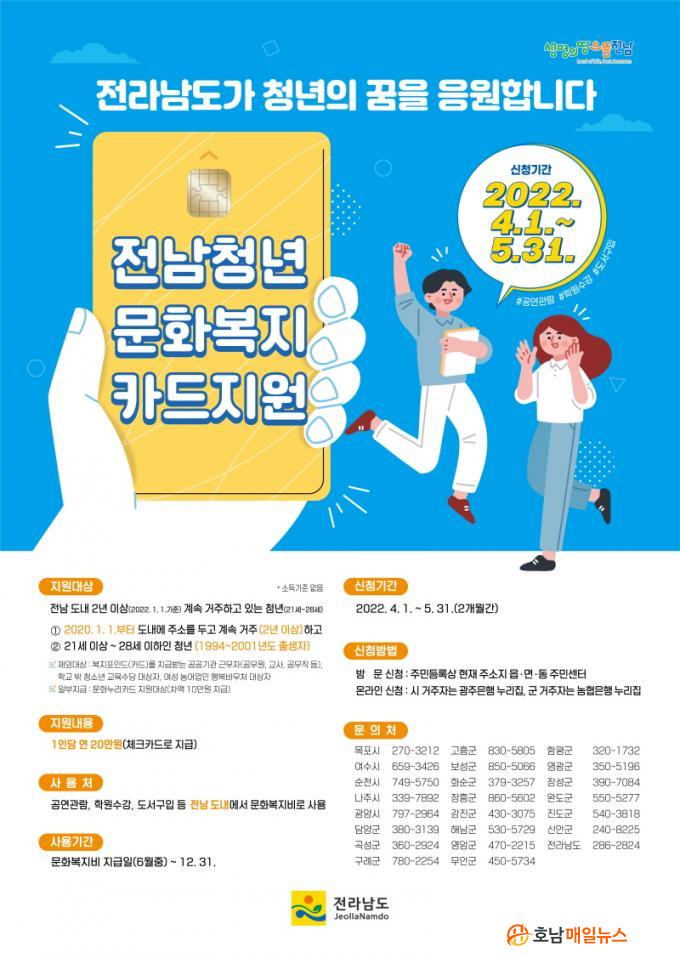 ¿ÃÇØ óÀ½À¸·Î ½ÃÇàµÇ´Â ¡®Àü³²Ã»³â ¹®Èº¹ÁöÄ«µå Áö¿ø»ç¾÷¡¯Àº 2020³â 1¿ù 1ÀÏ ÀüºÎÅÍ Àü¶ó³²µµ¿¡ ÁÖ¼Ò¸¦ µÎ°í 2³â ÀÌ»ó °è¼Ó °ÅÁÖÇϰí ÀÖ´Â 21¼¼~28¼¼(1994~2001³â»ý) û³â¿¡°Ô 1ÀÎ´ç ¿¬ 20¸¸ ¿øÀÇ ¹®Èº¹Áöºñ¸¦ Áö±ÞÇÏ´Â »ç¾÷ÀÌ´Ù.