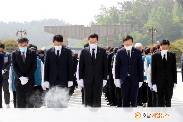 À̳¯ ÇÕµ¿Âü¹è´Â À̿뼷 ½ÃÀå°ú ±èµ¿Âù ±¤ÁÖ½ÃÀÇȸ ÀÇÀå, ½Ã °£ºÎ, ½ÃÀÇȸ ÀÇ¿ø, °ø»ç¡¤°ø´Ü ¹× ÃâÀÚ¡¤Ã⿬±â°üÀå, 5¡¤18±â³äÀç´Ü ÀÌ»çÀå, 5¡¤18´Üü(À¯Á·È¸¡¤ºÎ»óÀÚȸ¡¤±¸¼ÓºÎ»óÀÚȸ) µî 80¿©¸íÀÌ Âü¿©Çß´Ù.