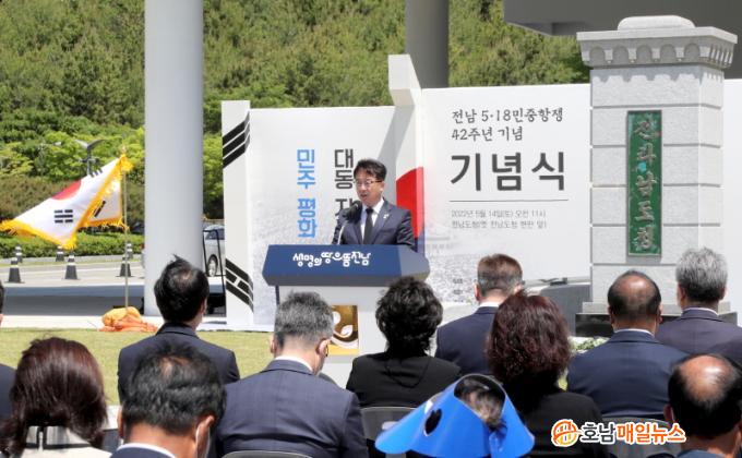 ±â³ä½ÄÀº ¡®¿À¿ù, Áø½ÇÀÇ ÈûÀ¸·Î! ½Ã´ëÀÇ ºûÀ¸·Î!¡¯¸¦ ÁÖÁ¦·Î Àü³²µµÁö»ç ±ÇÇÑ´ëÇà ¹®±ÝÁÖ ÇàÁ¤ºÎÁö»ç, ¹®°æ½Ä Àü³²5‧18¹ÎÁßÇ×Àï 42Áֳ⠱â³äÇà»çÀ§¿øÀå, ±¹È¸ÀÇ¿ø, µµÀÇ¿ø, 5‧18À¯°øÀÚ ¹× À¯Á·, µµ¹Î µî 300¿© ¸íÀÌ Âü¼®ÇÑ °¡¿îµ¥, ¾ö¼÷ÇÏ°í °æ°ÇÇÑ ºÐÀ§±â ¼Ó¿¡¼ ÁøÇàµÆ´Ù.