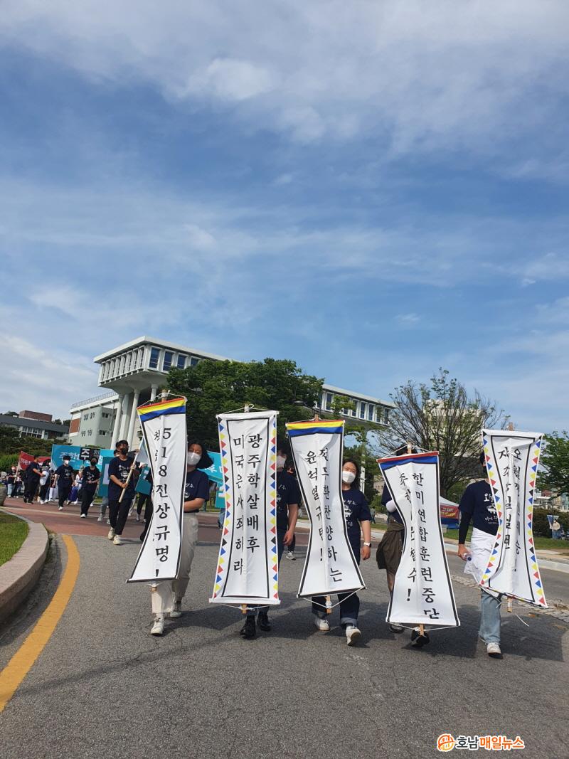 ÇлýµéÀº Àü³²´ë~±¤ÁÖ¿ª~±Ý³²·Î~¿¾ Àü³²µµÃ» ¾Õ±îÁö 5§°¿¡ °ÉÄ£ ÇàÁø¿¡¼ ¡®±¤ÁÖÁ¤½Å °è½ÂÇØ ¹ÎÁÖÁÖÀÇ ÁöÄѳ»ÀÚ¡¯, ¡®±¤ÁÖÇлìÀÇ ¿øÈä ¹Ì±¹À» ¹Ý´ëÇÑ´Ù¡¯ µîÀÇ Çö¼ö¸·À» ³»°É°í 5¡¤18 Áø»ó±Ô¸í°ú Ã¥ÀÓÀÚ Ã³¹ú µîÀ» ¿ä±¸Çß´Ù. ¶Ç dz¹° ±æ³îÀÌ, ¡®¿ì¸®Çϳª µÇ¾î¡¯ µîÀÇ ³ë·¡¸¦ ºÎ¸£¸ç ¹ÎÁÖÈ ÀÇÁö¸¦ ´ÙÁ³´Ù. À̵éÀº À̳¯ Àú³á¿¡ ±Ý³²·Î ¹«´ë¿¡¼ Àü±¹´ëÇлý´ëȸ¿¡ Âü¿©ÇÑ µÚ ÇØ»êÇß´Ù.