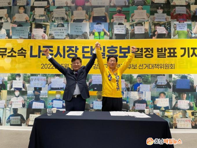¹«¼Ò¼Ó ³ªÁÖ½ÃÀå Èĺ¸ ´ÜÀÏȸ¦ ¼±¾ðÇß´ø °ÀÎ±Ô Èĺ¸¿Í ±èº´ÁÖ Èĺ¸¿¡ ´ëÇÑ ¿©·ÐÁ¶»ç °á°ú ³ªÁֽùÎÀº °ÀÎ±Ô Èĺ¸ÀÇ ¼ÕÀ» µé¾îÁá´Ù. Áö³ 16ÀÏ Àü°ÝÀûÀ¸·Î ¿©·ÐÁ¶»ç ¹æ½ÄÀÇ ÀÇÇÑ ´ÜÀÏȸ¦ ÇÕÀÇÇß´ø ¹«¼Ò¼Ó ³ªÁÖ½ÃÀå Èĺ¸ÀÎ °ÀÎ±Ô Èĺ¸¿Í ±èº´ÁÖ È帴 ¿À´Ã 19ÀÏ ±âÀÚȸ°ßÀ» °¡Áö°í °ÀÎ±Ô È常¦ ÅëÇÑ ´ÜÀÏȸ¦ ¼±¾ðÇß´Ù.