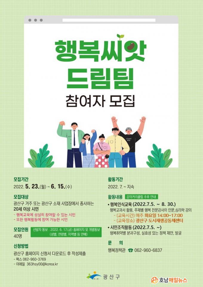 Âü¿© ½ÅûÀº 23ÀϺÎÅÍ 6¿ù15ÀϱîÁö·Î, ±¤»ê±¸ ´©¸®Áý¿¡¼ ½Åû¼ ¼½ÄÀ» ³»·Á ¹ÞÀº ÈÄ ÀÛ¼ºÇÏ¿© À̸ÞÀÏ(363hsy00@korea.kr)°ú ÆÑ½º(062-960-3769)·Î Á¦ÃâÇÏ¸é µÈ´Ù. ÀÚ¼¼ÇÑ »çÇ×Àº ±¤»ê±¸ ÇູÁ¤Ã¥°ü(062-960-6837)À¸·Î ¹®ÀÇÇÏ¸é µÈ´Ù.