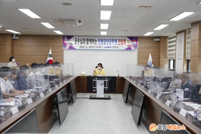 À̹ø °£´ãȸ´Â ´ë¹Î ÇàÁ¤¼ºñ½º¸¦ ó¸®ÇÏ´Â ¹Î¿ø´ã´ç °ø¹«¿øµéÀÇ °íÃæ°ú °ÇÀÇ»çÇ×, ¹Î¿ø Çö¾È¿¡ ´ëÇÑ ÀÚÀ¯·Î¿î ´ëÈÀÇ ÀåÀ» ¿±â À§ÇØ ¸¶·ÃµÈ ÀÚ¸®·Î À̵¿Áø Áøµµ±º¼ö¿Í ±ºÃ» ¹Î¿øºÀ»ç°ú, À¾․¸é ¹Î¿ø½Ç¿¡ ±Ù¹«ÇÏ´Â ¹Î¿ø´ã´ç °ø¹«¿ø 20¿©¸íÀÌ Âü¼®Çß´Ù.