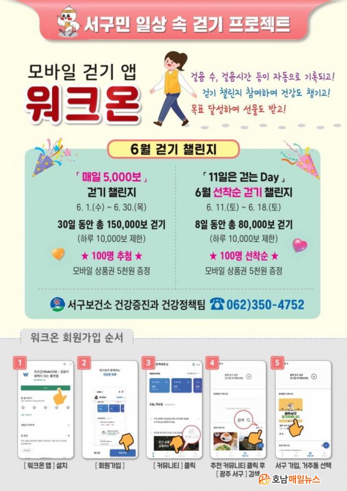 ¡®6¿ù ¸ÅÀÏ 5,000º¸ °È±â 縰Áö¡¯Âü¿©´ë»óÀº ¼±¸Áֹΰú ¼±¸ ¼ÒÀç Á÷ÀåÀ» ´Ù´Ï´Â ´©±¸³ª Âü¿© °¡´ÉÇϸç 6¿ù1ÀϺÎÅÍ 30ÀϱîÁö ÇÑ ´Þ°£ ¸ÅÀÏ 5,000º¸¸¦ °È°í ÃÑ 150,000º¸ (1ÀÏ 10,000º¸ Á¦ÇÑ) °È±â¸¦ ´Þ¼ºÇÑ Âü¿©ÀÚ Áß 100¸íÀ» Ãß÷ÇÏ¿© ¸ð¹ÙÀÏ »óǰ±Ç(5õ¿ø±Ç)À» ÁõÁ¤ÇÑ´Ù.