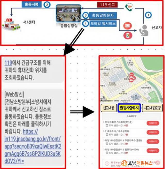 Àü³²¼Ò¹æº»ºÎ¿¡ µû¸£¸é 119Ã⵿ ¾Ë¸²¼ºñ½º´Â ½Å°íÀÚ¿¡°Ô Ã⵿»óȲÀ» ¹®ÀÚ·Î Àü¼ÛÇÏ´Â ´Ü¹æÇâ ¼ºñ½ºÀÇ ÇѰ踦 ³Ñ¾î, ½Å°íÀÚ°¡ Ã⵿Â÷·® À̵¿°æ·Î¸¦ ½Ç½Ã°£ È®ÀÎÇÒ ¼ö ÀÖ´Â ¾ç¹æÇâ ¼ºñ½º·Î °³¼±µÆ´Ù.