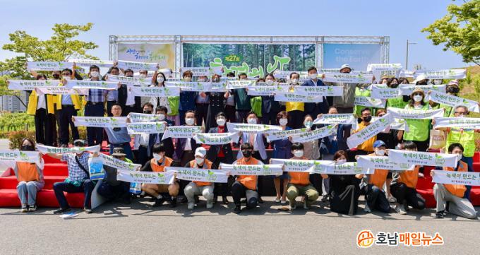 ¿©¼ö½Ã°¡ ÁÖÃÖ, ¿©¼öÁö¼Ó°¡´É¹ßÀüÇùÀÇȸ°¡ ÁÖ°üÇÑ À̳¯ Çà»ç¿¡´Â ȯ°æ´Üü¿Í À¯°ü±â°ü °ü°èÀÚ, ½Ã¹Î µî 80¿©¸íÀÌ Âü¼®Çß´Ù. ±â³ä½ÄÀº ȯ°æº¸Àü À¯°øÀÚ 10¸í¿¡ ´ëÇÑ Ç¥Ã¢°ú ÇÔ²² ±â³ä»ç¿Í Ãà»ç, 2050 ź¼ÒÁ߸³À» À§ÇÑ ³ì»ö¿©¼ö ÆÛÆ÷¸Õ½º µîÀÌ À̾îÁ³´Ù. ºÎ´ëÇà»ç·Î ³ìÁöÀÇ Á߿伺À» °Á¶Çϱâ À§ÇÑ À̼ø½Å°ø¿ø ¹«±Ãȵ¿»ê °Å¸§Áֱ⵵ ÁøÇàµÅ ´«±æÀ» ²ø¾ú´Ù.