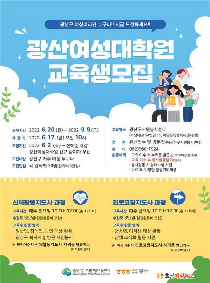 ±¤»ê¿©¼º´ëÇпø ±³À°ÀÏÁ¤Àº 2022³â 6¿ù 20ÀϺÎÅÍ 9¿ù 9ÀϱîÁö ÁøÇàµÇ¸ç ±¤»ê±¸¿¡ °ÅÁÖÇÏ´Â ¿©¼º ´©±¸¿¡°Ô³ª ±âȸ°¡ ¿·ÁÀÖÀ¸´Ï ¸¹Àº Âü¿©¿Í °ü½ÉÀ» ¹Ù¶õ´Ù.