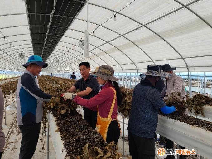 Àϼյ½±â Âü¿©ÀÚµéÀº ¹«´õ¿î ³¯¾¾¿¡µµ ÇϿ콺 ¾È¿¡¼ ¼öÈ® öÀÌ Áö³ª ½Ãµç µþ±â ÁÙ±â µî ºÎ»ê¹°À» ¹èÁö¿¡¼ Á¦°ÅÇØ ¿Å±â°í, ½Ã¼³À» Á¤ºñÇÏ´Â µî È¥ÀÚ¼´Â Çϱâ Èûµç ÀÛ¾÷À» Áß½ÉÀ¸·Î ÃßÁøÇß´Ù.