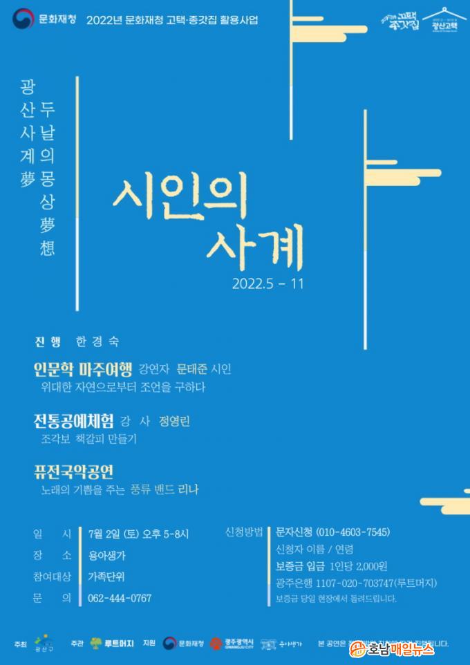 ÇÑÆí, ¡®½ÃÀÎÀÇ »ç°è¡¯´Â ±¤»ê±¸°¡ ÁÖÃÖÇÏ°í ¹®ÈÀçû¡¤±¤ÁÖ±¤¿ª½Ã°¡ Áö¿øÇÑ´Ù. Áö³ 5¿ù ¿ë¾Æ»ý°¡¿¡¼ ¡®ÀÚ³à¿Í ÇÔ²²ÇÏ´Â Àι®ÇÐ ¸¶ÁÖ¿©Ç࡯À» ÁÖÁ¦·Î ¿ÃÇØ ù ÇÁ·Î±×·¥ÀÌ ¼ºÈ²¸®¿¡ ¿¸° °¡¿îµ¥, ¿ÃÇØ ÇϹݱ⿡ µÎ Â÷·Ê ´õ ÇÁ·Î±×·¥À» ÁøÇàÇÒ °èȹÀÌ´Ù.