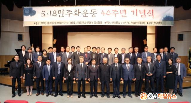 Àü³²´ë 5.18¿¬±¸¼Ò¿Í Àü³²´ë¹ÎÁÖµ¿¿ìȸ°¡ °øµ¿ ÁÖ°üÇÑ À̳¯ ±â³ä½Ä¿¡´Â Á¤º´¼® ÃÑÀå°ú ¹Ú½ÂÇö Ãѵ¿Ã¢È¸ÀåÀ» ºñ·ÔÇÑ ±³Á÷¿ø, Çлý°ú ÃÖ Ã¶ Àü³²´ë ¹ÎÁÖµ¿¿ìȸÀå°ú ȸ¿ø µî 200¿©¸íÀÌ Âü¼®ÇØ 5.18 40ÁÖ³âÀ» ±â³äÇß´Ù.