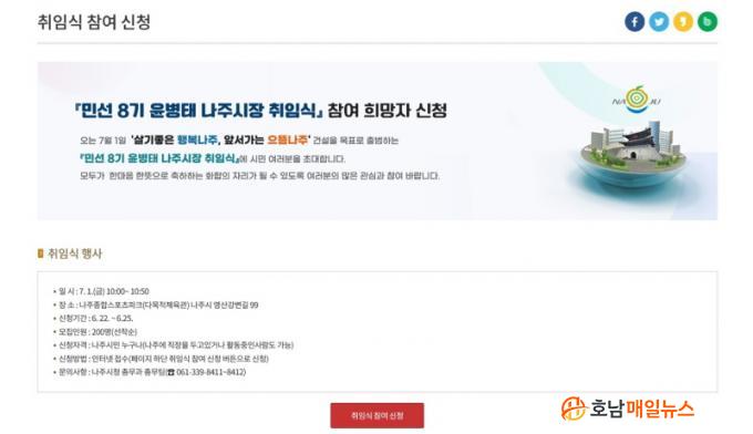 ¿©¼º±¸ ³ªÁÖ½ÃÀåÁ÷ ÀμöÀ§¿øÀåÀº ¡°12¸¸ ½Ã¹ÎÀÇ ±â´ë¸¦ ´ã¾Æ Äڷγª19ÀÇ ±ä ÅͳÎÀ» Áö³ª ¼ÒÅë°ú ÈÇÕÀ» ÃÖ¿ì¼±ÀÇ °¡Ä¡·Î ¡®´õ Å« ³ªÁÖ, ³ªÁÖ ´ëÀüȯ¡¯ÀÇ Ã»»çÁøÀ» ¹àÈ÷´Â ÃëÀÓ½ÄÀÌ µÉ °Í¡±À̶ó¸ç ¡°¹Î¼± 8±â ½ÃÁ¤ÀÇ Ã¹ ¹ß°ÉÀ½À» ³»µó´Â ¶æ±íÀº ÀÚ¸®¿¡ ¸¹Àº ½Ã¹ÎµéÀÇ °ü½É°ú Âü¿©¸¦ ºÎʵ台´Ù¡±°í ¹àÇû´Ù.