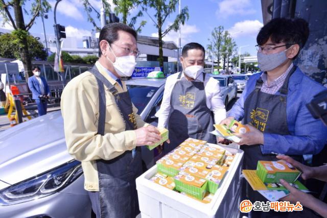 ±¤Áֽô ±¤ÁÖÁÖ¸Ô¹ä ÆÇ¸Å¾÷¼Ò, ±¤ÁÖµðÀÚÀÎÁøÈï¿ø, ¿Ü½Ä¾÷Áß¾Óȸ ±¤ÁÖ½ÃÁöȸ¿Í ÇÔ²² Åýñâ»çµéÀÌ ¸¹ÀÌ ¸ðÀÌ´Â ±¤Ãµµ¿ À¯½ºÄù¾î¿Í ±¤ÁÖ¼ÛÁ¤¿ª ¾Õ Åýý°Àå¿¡¼ ±¤ÁÖÁÖ¸Ô¹ä 1036°³(°¢ 518°³)¿Í ¸¶½ºÅ© 1¸¸°³(°¢ 5000°³)¸¦ Àü´ÞÇϰí ÁÖ¸Ô¹äÀ» È«º¸Çß´Ù.