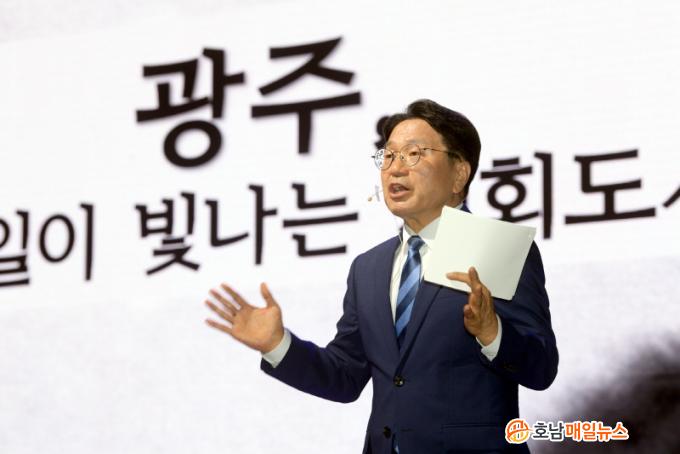 ° ½ÃÀåÀº ƯÈ÷ ¡°Ã»³âµé¿¡°Ô ´õ ¸¹Àº ±âȸ¸¦ Á¦°øÇϰí û³âÀÌ ½º½º·Î ÀÚ½ÅÀÇ ÀÏÀ» ¸¸µé¾î ÀÚ½ÅÀÇ ³»ÀÏÀ» °èȹÇÒ ¼ö ÀÖµµ·Ï Áö¿øÇϸç, 50 Ç÷¯½º ¼¼´ë´Â ÀÚ½ÅÀÇ ÀλýÀ» »õ·Ó°Ô µðÀÚÀÎÇÒ ÇнÀ°ú °æÇèÀÇ ±âȸ¸¦ Á¦°øÇØ ¡®³ªÀÇ »î¡¯ÀÌ ºû³ª°í ¹Ì·¡º¸´Ù ´õ °¡±î¿î ¡®³»ÀÏ¡¯ÀÌ ºû³ª´Â ±¤ÁÖ°¡ µÇµµ·Ï Çϰڴ١±¸ç ¡°¸Ó±Ý¾ú´ø ºûÀ» ¹ß»êÇÏ´Â µµ½Ã, ¡®±âȸµµ½Ã ±¤ÁÖ¡¯·Î ÇÔ²² ³ª¾Æ°¡ÀÚ¡±°í ´çºÎÇß´Ù.