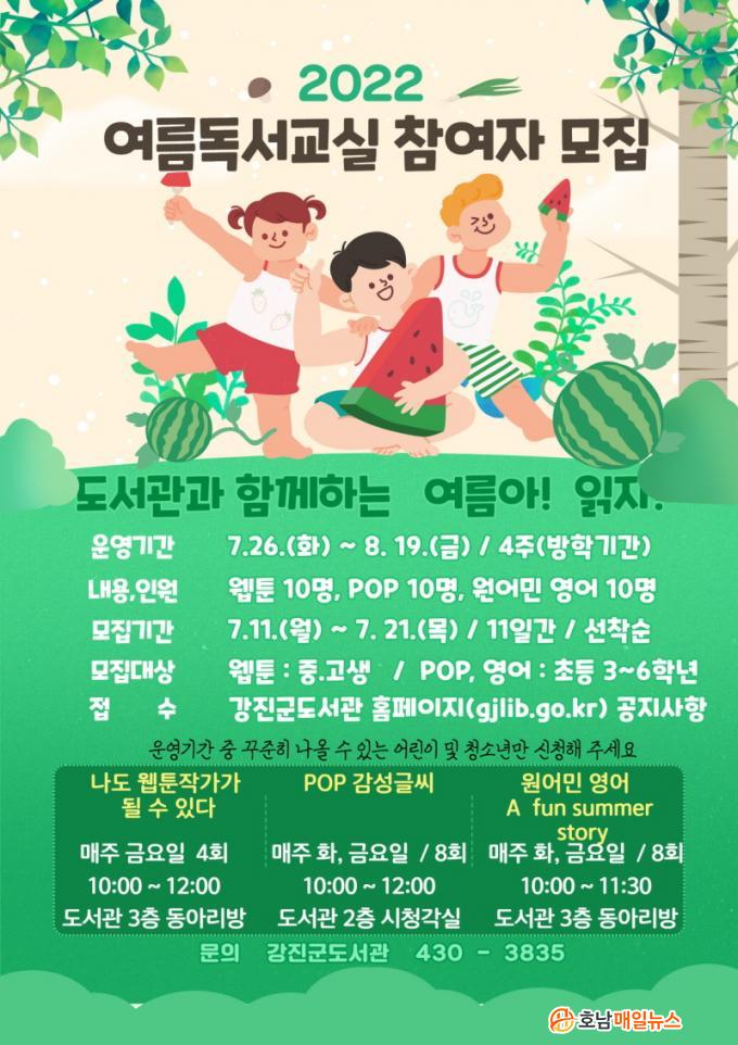 µ¶¼±³½ÇÀº ¸Å³â ¿©¸§°ú °Ü¿ï ±¹¸³¾î¸°ÀÌû¼Ò³âµµ¼°ü¿¡¼ Áö¿ª µ¶¼¹®ÈÁøÈïÀ» ¸ñÀûÀ¸·Î Áö¿øÇϰí ÀÖÀ¸¸ç, À̹ø ¿©¸§µ¶¼±³½ÇÀº ¿À´Â 26ÀϺÎÅÍ 4ÁÖ µ¿¾È °Áø±ºµµ¼°ü¿¡¼ ¡ã³ªµµ À¥Å÷ÀÛ°¡°¡ µÉ ¼ö ÀÖ´Ù, ¡ãPOP °¨¼º±Û¾¾ ¹è¿ö¿ä, ¡ã¿ø¾î¹Î ¿µ¾î¼±»ý´Ô°ú ÇÔ²²ÇÏ´Â Àç¹Ì³ ¿©¸§ À̾߱⠵î 3°³ ÇÁ·Î±×·¥ÀÌ ÁøÇàµÈ´Ù.