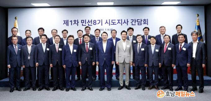 8ÀÏ °£´ãȸ´Â ´ëÅë·É°ú 16°³ ½Ã‧µµÁö»ç, °æÁ¦ºÎÃѸ®, Çà¾ÈºÎ Àå°ü µî 26¸íÀÌ Âü¼®ÇÑ °¡¿îµ¥ ¹Î¼±8±â ½Ã‧µµÁö»ç ÃëÀÓ ÃàÇÏ¿Í »õ Á¤ºÎÀÇ ÁÖ¿äÁ¤Ã¥ ¹æÇâ¿¡ ´ëÇÑ ¾È°Ç¹ßÇ¥, ¸¸Âù ¹× ȯ´ã µîÀÇ ¼øÀ¸·Î ÁøÇàµÆ´Ù.