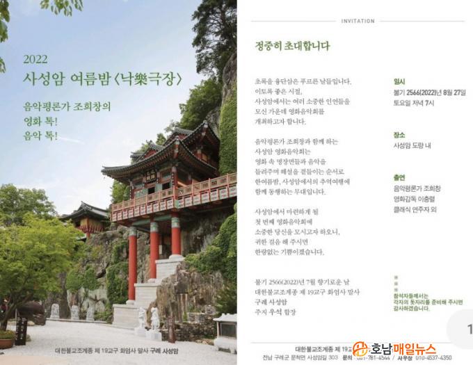 ÇÑÆí, Ⱦö»ç ¸»»ç »ç¼º¾Ï(ÁÖÁö. ¿ì¼®½º´Ô)¿¡¼µµ 8¿ù 27ÀÏ Àú³á 7½Ã ù ¹øÂ° ¿µÈ±ØÀåÀÌ ¸¶·ÃµÈ´Ù. ¡¸³«¶ô±ØÀ塹À̶ó´Â À̸§À¸·Î ¿¸®°Ô µÉ »ç¼º¾Ï ¿µÈ±ØÀåÀº ¡® ¿µÈ Åå! À½¾Ç Åå! À̶ó´Â ºÎÁ¦·Î ¿ª½Ã À½¾Ç Æò·Ð°¡ Á¶ÈñâÀÇ ¸À±ò½º·± ÇØ¼³·Î ÁøÇàµÇ´Âµ¥, »ç¼º¾ÏÀº ¸î ÇØ Àü ±¸·ÊÁö¿ª¿¡ Æø¿ì°¡ ³»·Á ¼Ò¶¼°¡ ¾ÏÀÚ·Î ¿Ã¶ó Âüº¯À» ÇÇÇÑ »çÂû·Îµµ À¯¸íÇÏ´Ù.