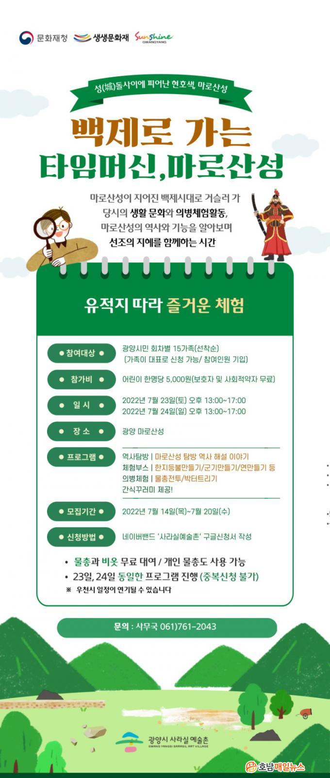 ¡®¹éÁ¦·Î °¡´Â ŸÀÓ¸Ó½Å, ¸¶·Î»ê¼º¡¯Àº 7¿ù 23, 24ÀÏ ¿ÀÈÄ 13~17½Ã 2ȸ °³ÃÖÇϸç, Âü¿© ½Åû µî ÀÚ¼¼ÇÑ »çÇ×Àº Æ÷½ºÅ͸¦ Âü°íÇϰųª ±¤¾ç½Ã»ç¶ó½Ç¿¹¼úÃÌ »ç¹«±¹À¸·Î ¹®ÀÇÇÏ¸é ¾Ë ¼ö ÀÖ´Ù.