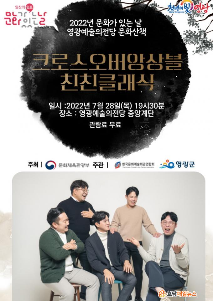 Çѱ¹¹®È¿¹¼ú¿¬ÇÕȸÀÇ 2022³â Áö¿ª¹®È¿¹¼úȸ°ü ¹®È°¡ ÀÖ´Â ³¯ Áö¿ø °ø¸ð»ç¾÷À¸·Î ¼±Á¤µÈ °ø¿¬À̸ç, ¹®ÈüÀ°°ü±¤ºÎ¿¡¼ ÁÖÃÖÇϰí Çѱ¹¹®È¿¹¼úȸ°ü¿¬ÇÕȸ¿Í ¿µ±¤±º¿¡¼ ÁÖ°üÇÑ´Ù. °ü¶÷·á´Â ¹«·áÀÌ¸ç ¿µ±¤¿¹¼úÀÇÀü´ç ¾ß¿Ü°ø¿¬Àå(Áß¾Ó°è´Ü)À» ã¾Æ¿À¸é ´©±¸³ª °ü¶÷ °¡´ÉÇÏ´Ù.